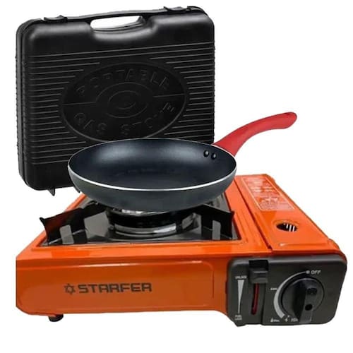 Fogão Fogareiro Portátil Com Ignição Automática 1 Boca - Starfer O fogão Starfer é ideal para você que procura rapidez e praticidade na hora de acampar e preparar suas refeições. Seu design revestido de aço inoxidável garante qualidade imprescindível. Com uma boca, acendimento automático, incluindo uma grelha móvel em aço inoxidável com protetor, chama regulável e compartimento com trava para instalação do cartucho. Indicado para viagens, acampamentos e pequenos eventos, utilizado em ambientes abertos.CARACTERÍSTICAS TÉCNICAS:Material: Aço inoxidávelMedidas: 34cm comprimento x 8cm altura x 26cm largura Fonte de gás: Gás butanoQuantidade de queimadores: 1Controle de chamas: SimSistema de ignição: AutomáticaAcompanha maleta: SimMarca: StarferRef.: 6099904