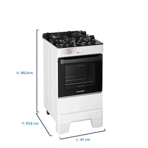 Queimadores: Com trempes duplas em aço esmaltado, ele é altamente durável e resistente ao desgaste do tempo, além de proporcionar maior estabilidade ao acomodar as panelas. A distribuição de potência dos queimadores é otimizada para atender a diferentes necessidades culinárias: dois queimadores para uso familiar, com potência de 2,0 kW cada e dois queimadores pequenos com potência de 1,7 kW.