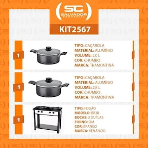 MUITO IMPORTANTE:-- CONFERIR PRODUTOS NO ATO DO RECEBIMENTO. NÃO ACEITAR PRODUTOS COM EMBALAGEM VIOLADA (AMASSADO, RASGADO, ABERTO, QUEBRADO, ETC), A RECUSA DEVE SER FEITA NO ATO. Componentes do Kit;1 - Caçarola Turim Alumínio Antiaderente Chumbo 18cm 2,0l Ptc1 - Tramontina 202616181 - Caçarola Turim Alumínio Antiaderente Chumbo 20cm 2,8L Ptc2 - Tramontina 202616201 - Fogão Industrial 2 Bocas Duplas Bravo BR2BF Branco - Venâncio Fogão Industrial 2 Bocas Bravo Branco Venâncio + 2 Caçarolas Tramontina Turim Eleve a sua cozinha para o próximo nível com o Fogão Industrial 2 Bocas Bravo Branco Venâncio + 2 Caçarolas Tramontina Turim, a solução perfeita para quem busca alto desempenho e qualidade profissional. Ideal para restaurantes, lanchonetes e food trucks, este conjunto robusto otimiza o preparo dos seus pratos. A alta potência das chamas assegura o cozimento rápido e uniforme, fundamental para agilizar a sua produção. Queimadores de alto rendimento proporciona maior economia de gás. Fabricado com aço carbono de alta qualidade, este fogão oferece extrema durabilidade e resistência para o uso contínuo e intenso. O design compacto facilita a organização do espaço, otimizando o fluxo de trabalho. Adquira agora o Fogão Industrial Venâncio e eleve a qualidade e eficiência da sua culinária! Ficha Técnica Caçarola:- Capacidade: 2,0L;- Alumínio com 1,2mm de espessura;- Revestimento anti-aderente;- Altura com tampa : 12,5cm;- Altura sem tampa: 8cm;- Altura interna: 7,8cm;- Diâmetro: 18cm;- Comprimento total: 30,5cm;- Garantia de 90 dias para vícios ou defeitos de fabricação;- Não utilizar em temperaturas superiores à 260C. Ficha Técnica Caçarola: Capacidade: 2,8L;- Alumínio com 1,2mm de espessura;- Revestimento anti-aderente;- Altura com tampa: 13,5cm;- Altura sem tampa: 9cm;- Altura interna: 8,7cm;- Diâmetro: 20cm;- Comprimento total: 32,5cm;- Garantia de 90 dias para vícios ou defeitos de fabricação;- Não utilizar em temperaturas superiores à 260C. Ficha Técnica Fogão :- Fogão industrial;- Gás GLP baixa pressão;- Mesa esmaltada a fogo com easy clean, que facilita a limpeza;- Corpo super reforçado em aço carbono com acabamento em pintura a pó eletrostática com base fosfatizada;- Grelhas redondas em ferro fundido para todos os modelos;- Queimadores de alto rendimento, em ferro fundido, possuindo potência de 4.090kcal no modelo chama tripla frontal e 3.659kcal no modelo chama dupla;- Queimador chama interna, com espalha chamas em Ferro Fundido;- Fogão com queimadores chama tripla; Quantidade de Bocas: 2 | Tipo de Instalação: 1 | Tipo de montagem: 1 | Alimentação: a Gás | Cor: Branco