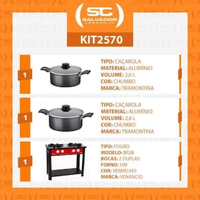MUITO IMPORTANTE:-- CONFERIR PRODUTOS NO ATO DO RECEBIMENTO. NÃO ACEITAR PRODUTOS COM EMBALAGEM VIOLADA (AMASSADO, RASGADO, ABERTO, QUEBRADO, ETC), A RECUSA DEVE SER FEITA NO ATO. Componentes do Kit;1 - Caçarola Turim Alumínio Antiaderente Chumbo 18cm 2,0l Ptc1 - Tramontina 202616181 - Caçarola Turim Alumínio Antiaderente Chumbo 20cm 2,8L Ptc2 - Tramontina 202616201 - Fogão Industrial 2 Bocas Duplas Bravo BR2BF Vermelho - Venâncio Fogão Industrial 2 Bocas Bravo Vermelho Venâncio + 2 Caçarolas Tramontina Turim Eleve a sua cozinha para o próximo nível com o Fogão Industrial 2 Bocas Bravo Vermelho Venâncio + 2 Caçarolas Tramontina Turim, a solução perfeita para quem busca alto desempenho e qualidade profissional. Ideal para restaurantes, lanchonetes e food trucks, este conjunto robusto otimiza o preparo dos seus pratos. A alta potência das chamas assegura o cozimento rápido e uniforme, fundamental para agilizar a sua produção. Queimadores de alto rendimento proporciona maior economia de gás. Fabricado com aço carbono de alta qualidade, este fogão oferece extrema durabilidade e resistência para o uso contínuo e intenso. O design compacto facilita a organização do espaço, otimizando o fluxo de trabalho. Adquira agora o Fogão Industrial Venâncio e eleve a qualidade e eficiência da sua culinária! Ficha Técnica Caçarola:- Capacidade: 2,0L;- Alumínio com 1,2mm de espessura;- Revestimento anti-aderente;- Altura com tampa : 12,5cm;- Altura sem tampa: 8cm;- Altura interna: 7,8cm;- Diâmetro: 18cm;- Comprimento total: 30,5cm;- Garantia de 90 dias para vícios ou defeitos de fabricação;- Não utilizar em temperaturas superiores à 260C. Ficha Técnica Caçarola: Capacidade: 2,8L;- Alumínio com 1,2mm de espessura;- Revestimento anti-aderente;- Altura com tampa: 13,5cm;- Altura sem tampa: 9cm;- Altura interna: 8,7cm;- Diâmetro: 20cm;- Comprimento total: 32,5cm;- Garantia de 90 dias para vícios ou defeitos de fabricação;- Não utilizar em temperaturas superiores à 260C. Ficha Técnica Fogão :- Fogão industrial;- Gás GLP baixa pressão;- Mesa esmaltada a fogo com easy clean, que facilita a limpeza;- Corpo super reforçado em aço carbono com acabamento em pintura a pó eletrostática com base fosfatizada;- Grelhas redondas em ferro fundido para todos os modelos;- Queimadores de alto rendimento, em ferro fundido, possuindo potência de 4.090kcal no modelo chama tripla frontal e 3.659kcal no modelo chama dupla;- Queimador chama interna, com espalha chamas em Ferro Fundido;- Fogão com queimadores chama tripla; Quantidade de Bocas: 2 | Tipo de Instalação: 1 | Tipo de montagem: 1 | Alimentação: a Gás | Cor: Vermelho