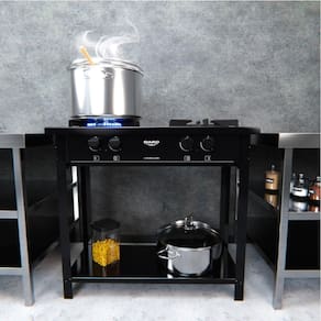 Versátil (Piso ou Bancada): Os pés são removíveis, permitindo que o fogão seja utilizado tanto no chão, em sua altura autêntico, quanto sobre uma bancada, adaptando-se perfeitamente à sua cozinha.