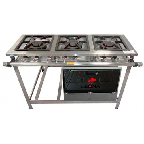 Fogão Industrial de Baixa Pressão À Gás GLP (BOTIJÃO)Linha Standard Perfil 5Grelhas em ferro fundido 30cmx30cm ( 6 dedos)3 Queimadores Duplos 140mmBandeja coletora de resíduoChapa em aço Inox 430Forno de 52L Tampa de VidroMedidas do Fogão Montado:Altura : 80cmLargura : 107cmProfundidade : 47cm Marca: Não Informado