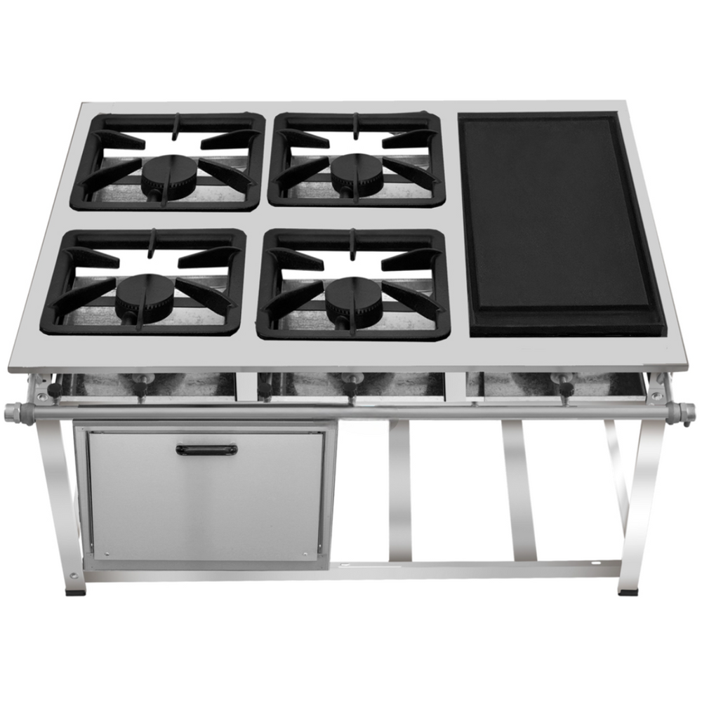 Fogão Industrial de Baixa Pressão À Gás GLP (BOTIJÃO)Linha Standard Perfil 5Grelhas em ferro fundido 30cmx30cm2 Queimadores Duplos 140mm 2 Simples 100mmBandeja coletora de resíduoChapa em aço Inox 430Forno de 92L Tampa em Aço InoxMedidas do Fogão Montado:Altura : 80cmLargura : 107cmProfundidade : 80cm Marca: Não Informado