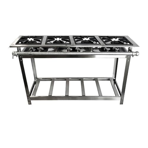 Fogão Industrial de Baixa Pressão À Gás GLP (BOTIJÃO)Linha Standard Perfil 5Grelhas em ferro fundido 30cmx30cm4 Queimadores Duplos 140mmBandeja coletora de resíduoChapa em aço Inox 430Medidas do Fogão Montado:Altura : 80cmLargura : 141cmProfundidade : 47cm Marca: Não Informado