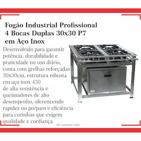 Fogão Industrial de Baixa Pressão À Gás GLP (BOTIJÃO)Linha Tradicional Perfil 7Grelhas em ferro fundido 30cmx30cm4 Queimadores Duplos 170mmBandeja coletora de resíduoChapa em aço Inox 430Forno de 92L Tampa em Aço InoxMedidas do Fogão Montado:Altura : 80cmLargura : 73cmProfundidade : 83cm Marca: Não Informado Ean: 7897316892855