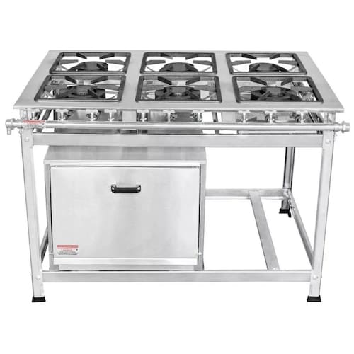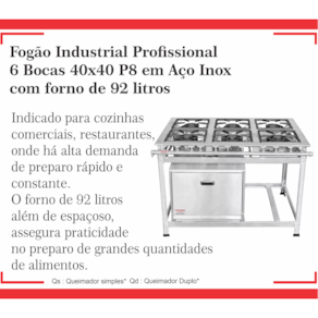 Fogão Industrial 6 Bocas 40x40 P8 em Aço Inox com Forno03 Queimadores Duplos 170mm03 Queimadores Simples 130mmGrelhas em Ferro Fundido Queimadores em Ferro Fundido Estrutura Confeccionada em Aço Inox 430Forno de 92L com Tampa em Aço Inox Perfil 8 (8cm Entre os Queimadores) Garantia : 06 Meses Contra Defeitos de Fabricação.Medidas : Altura : 80cmLargura : 148cmProfundidade : 111cm Marca: Não Informado Ean: 7897451881202