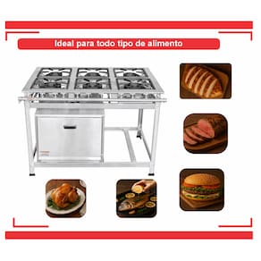 Fogão Industrial 6 Bocas 30x30 P7 em Aço Inox com Forno03 Queimadores Triplos 170mm03 Queimadores Simples 100mmGrelhas em Ferro Fundido Queimadores em Ferro Fundido Estrutura Confeccionada em Aço Inox 430Forno de 92L Tampa em Aço InoxPerfil 7 (7cm Entre os Queimadores) Garantia : 06 Meses Contra Defeitos de Fabricação.Medidas :Altura : 80cmLargura : 115cmProfundidade : 83cm Marca: Não Informado Ean: 7892348075108