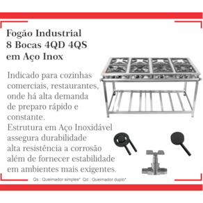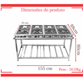 Fogão Industrial de Baixa Pressão à Gás GLP (BOTIJÃO) Linha Inox Mesa Perfil 7 Grelhas em ferro fundido 30x30CM (6 dedos) 4 Queimadores Duplos de 170mm e 4 Simples de 130mm em Ferro Fundido Bandeja coletora de resíduo em Aço Galvanizado Estrutura em aço inox 430 (mesa, pés, paneleiro) Dimensões do Fogão Montado: ALTURA: 81 cm LARGURA: 155 cm PROFUNDIDADE: 88 cm