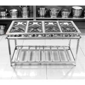 Fogão Industrial de Baixa Pressão à Gás GLP (BOTIJÃO) Linha Inox Mesa Perfil 7 Grelhas em ferro fundido 30x30CM (6 dedos) 4 Queimadores Triplos de 170mm e 4 Simples de 130mm em Ferro Fundido Bandeja coletora de resíduo em Aço Galvanizado Estrutura em aço inox 430 (mesa, pés, paneleiro) Dimensões do Fogão Montado: ALTURA: 81 cm LARGURA: 155 cm PROFUNDIDADE: 88 cm