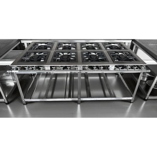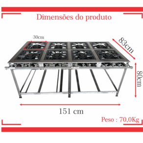 Fogão Industrial de Baixa Pressão À Gás GLP (BOTIJÃO)Linha Tradicional Perfil 7Grelhas em ferro fundido 30cmx30cm8 Queimadores Duplos 170mmBandeja coletora de resíduoChapa em aço Inox 430Medidas do Fogão Montado:Altura : 80cmLargura : 151cmProfundidade : 83cm Marca: Não Informado Ean: 7890161242653