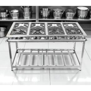 Fogão Industrial de Baixa Pressão à Gás GLP (BOTIJÃO) Linha Inox Mesa Perfil 7 Grelhas em ferro fundido 30x30CM (6 dedos) 4 Queimadores Triplos de 170mm e 4 Simples de 130mm em Ferro Fundido Bandeja coletora de resíduo em Aço Galvanizado Estrutura em aço inox 430 (mesa, pés, paneleiro) Dimensões do Fogão Montado: ALTURA: 81 cm LARGURA: 155 cm PROFUNDIDADE: 88 cm