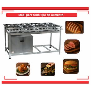 Fogão Industrial de Baixa Pressão à Gás GLP (BOTIJÃO) Linha Luxo Inox Mesa Perfil 8 Grelhas em ferro fundido 40x40CM 8 Queimadores Triplos de 170mm em Ferro Fundido Bandeja coletora de resíduo em Aço Galvanizado Estrutura em aço inox 430 (mesa, pés, paneleiro)