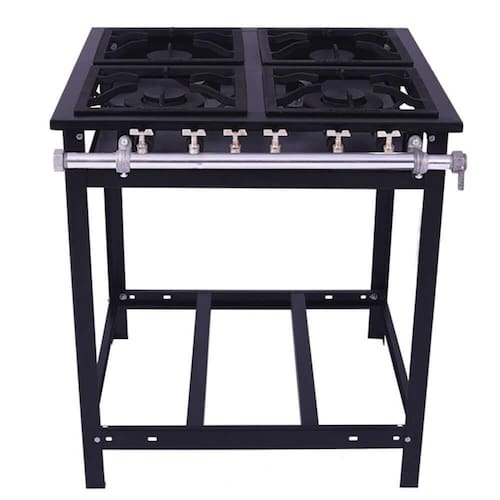 DESCRIÇÃO DO FOGÃO A GÁS 4 BOCAS 30X30 - Gás GLP baixa pressão; - Corpo e mesa de aço carbono super resistente com acabamento em pintura a pó eletrostática, com base fostatizada, grelha 30x30 e mesa com perfil de 5cm; - Tubo distribuidor (varão) de 3/4" cromado; - Registro cromado de 1/4"; - Totalmente desmontável para facilitar o transporte e armazenamento; - Modelos produzidos com tampão no distribuidor, para posterior colocação de registro para forno; - Grelhas e queimadores em ferro fundido; - Modelo com 4 queimadores, sendo 2 queimadores simples com 100mm de diâmetro e 2 queimadores duplos de 160mm; - Queimadores potência de 1.938kcal/h no modelo simples e 4.959 kcal/h no modelo duplo; - Queimador com encaixe de fácil remoção para limpeza e manutenção; - Fácil regulagem de entrada de oxigênio; - Limpeza e manutenção facilitados, pois os queimadores são encaixados facilitando a remoção; - Equipamento para uso industrial e profissional;