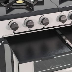 - Queimadores de alto rendimento, em ferro fundido, possuindo potência de 4.090kcal no modelo chama tripla frontal e 3.659kcal no modelo chama dupla;