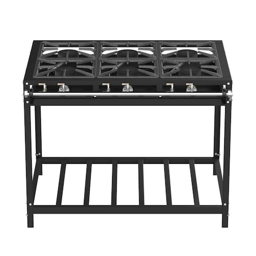 Características: Fogão Industrial FI 630, Baixa Pressão, 6 Queimadores de 120 mm, Trempes de Ferro Fundido de 30 x 30 cm, Queimadores e Espalhadores em Ferro Fundido pintados de Preto, Perfil da Mesa em "U" de 60 mm, Bandeja Coletora de Resíduos, Corpo Desmontável facilitado o Transporte.