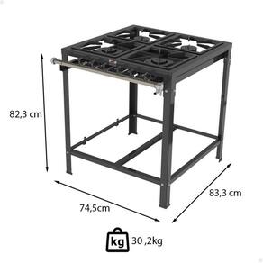 O fogão é fabricado em aço-carbono com pintura epóxi e conta com grelhas de ferro fundido, o que garante alta resistência e facilidade de manutenção.