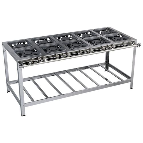 Fogão Industrial Stori Premium 10 Bocas 30x30 M17 Aço Inox 430 Metalmaq Fogão Baixa Pressão Fogão Industrial Stori Premium 10 Bocas Baixa Pressão 30x30 P6,5 M17 Metalmaq. Ideal para restaurantes, cozinhas indústriais e similares. Quadro monobloco com as bocas estampadas em uma só chapa, evitando soldas e acumulo de resíduos. Registro regulador de gás, confeccionado em latão duro niquelado e cromado. Tubo distribuidor de gás, confeccionado em liga especial de alumínio, durabilidade polido de 1. Queimadores e grelhas fundidos em alta temperatura, atingindo alto padrão de dureza. ATENÇÃO: Fogão entregue desmontado. QUEIMADORES: 5 simples e 5 Duplos. PESO: 93,1kg. DIMENSÕES(CxAxL): 181,7x81,5x85,9cm. Fogão Industrial Stori Premium 10 Bocas Baixa Pressão 30x30 P6,5 M17 Metalmaq é na Atau. Modelo - 30x30 Sem Forno e Sem Chapa Marca - Metalmaq Modelo - M17 Frente - 181,7cm Altura - 81,5cm Profundidade - 85,9cm Peso - 93,1kg