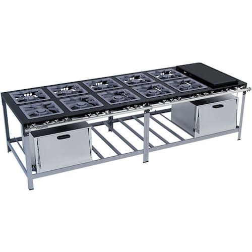 Fogão Industrial Stori Premium 10 Bocas 40x40 2 Fornos Com Chapa M32 Metalmaq Fogão Baixa Pressão Pintado Fogão Industrial Stori Premium 10 Bocas 2 Fornos com Chapa Baixa Pressão 40x40 P6,5 M32 Metalmaq. Ideal para restaurantes, cozinhas indústriais e similares. Quadro monobloco com as bocas estampadas em uma só chapa, evitando soldas e acumulo de resíduos. Registro regulador de gás, confeccionado em latão duro niquelado e cromado. Tubo distribuidor de gás, confeccionado em liga especial de alumínio, durabilidade polido de 1. Queimadores e grelhas fundidos em alta temperatura, atingindo alto padrão de dureza. ATENÇÃO: Fogão entregue desmontado. QUEIMADORES: 5 simples e 5 duplos. LITRAGEM FORNO: 94 Litros. PESO: 169,5kg. DIMENSÕES EXTERNA FORNO(CxAxL): 67x44x65. DIMENSÕES(CxAxL): 278,9x81,5x106,8cm. Fogão Industrial Stori Premium 10 Bocas 2 Fornos com Chapa Baixa Pressão 40x40 P6,5 M32 Metalmaq é na Atau. Modelo - 40x40 Com Forno e Com Chapa Marca - Metalmaq Modelo - M32 Frente - 278,9cm Altura - 81,5cm Profundidade - 106,8cm Peso - 169,5kg