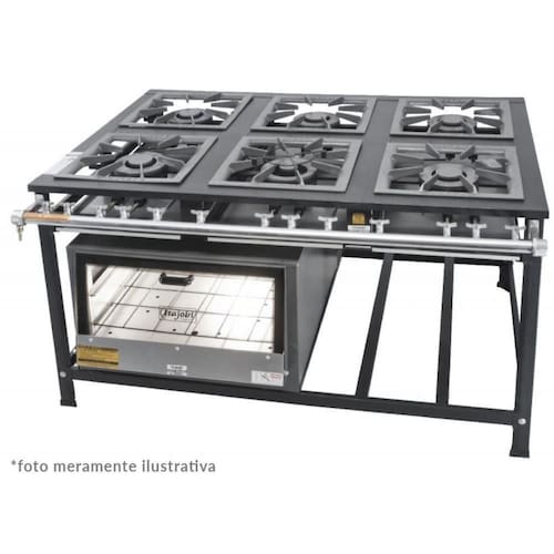 Fogão Industrial Tradicional 40x40 6 Bocas Com Forno Itajobi Fogão Baixa Pressão 40x40 Fogão Industrial Tradicional 40x40 Baixa Pressão 6 Bocas com Forno Itajobi. Ideal para cozinhas, restaurantes, bares e similares. Confeccionado em chapa aço inox 430. Possui 6 bocas de baixa pressão, sendo: 3 queimadores simples e 3 queimadores duplos, fabricados em ferro fundido. Tubo coletor de gás zincado e bandeja coletora de resíduos. CONSUMO DE GÁS QUEIMADOR SIMPLES: 0,200kg/hr. CONSUMO DE GÁS QUEIMADOR DUPLO: 0,360kg/hr. DIMENSÕES(CxAxL): 152x80x111cm. CAPACIDADE DO FORNO: 87 Litros. Fogão Industrial Tradicional 40x40 Baixa Pressão 6 Bocas com Forno Itajobi é na Atau. Tamanho - 6 Bocas Modelo - 40x40 Com Forno