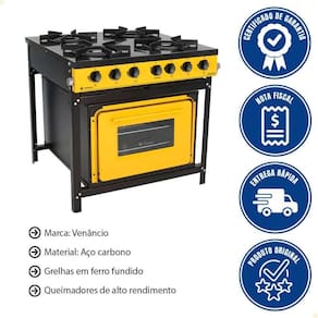 - O Fogão Industrial Venâncio Bravo 4 Bocas Amarelo com Forno une queimadores de alto rendimento, forno espaçoso e mesa esmaltada easy clean, garantindo eficiência, limpeza facilitada e resultados consistentes.