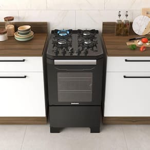 O top control na mesa oferece mais ergonomia e facilidade ao manusear os botões. Já as trempes individuais em ferro fundido com 8 apoios garantem estabilidade para suas panelas. E o forno? Vem com duas prateleiras (uma deslizante e uma fixa), além de lâmpada blindada, perfeito para acompanhar o preparo de receitas com mais conforto e visibilidade.
