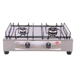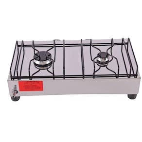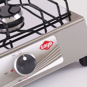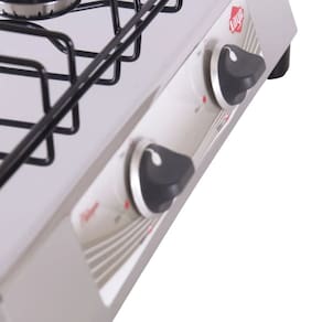 Gabinete externo em aço inoxidável. 02 queimadores de calor esmaltados (01 grande e 01 pequeno). Trempe esmaltada removível. Painel indicativo de nível de calor em braile. 02 manípulos (botões) de controle de gás em 03 posições.Tipo