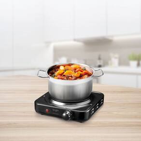 Características Técnicas: Fogão de mesa elétrico com uma placa de aquecimento e potência de 1000w, 5 níveis de temperatura, indicação luminosa de aquecimento e termostato