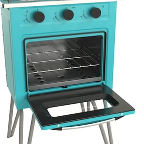 Fogão portátil Gemini Vetro com 2 queimadores médios, trempes esmaltadas, mesa em inox, respaldo, botões removíveis e forno com revestimento Easy Clean e 22,4 litros de volume.Tipo
