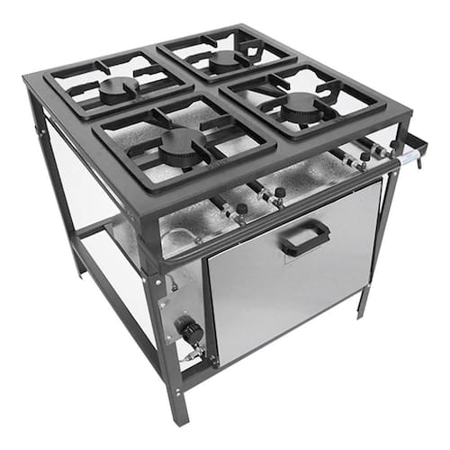 Indicado para restaurantes e cozinhas industriais de médio porte, o Fogão 4 Bocas Stand Baixa Pressão conta com quadro superior estampado com perfil 5, registros em latão forjado e tubo de distribuição de gás com entrada reversível.
