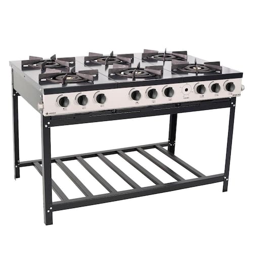 O Fogão Industrial Bravo conta com 6 bocas e mesa esmaltada a fogo com sistema Easy Clean, facilitando a limpeza. Conta com sistema de gás GLP de baixa pressão e queimadores de alto rendimento fabricados em ferro fundido, possuindo potência de 3.636kcal/h nas chamas triplas frontais, 3.021kcal/h nas chamas duplas traseiras e consumo de gás de 1,788kg/h