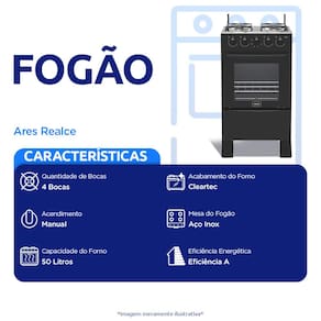 Fogão Realce 4 Bocas Ares Manual Mesa de Inox Forno 50 Litros - Sem voltagem
