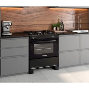 Além disso, conta com forno de fácil limpeza, vidro duplo para melhor isolamento térmico e trempes esmaltadas com seis pontos de apoio, proporcionando estabilidade e segurança no preparo das refeições.