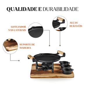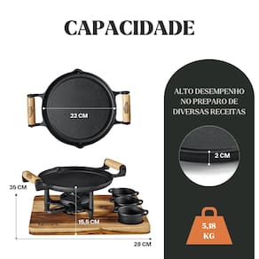 Produto fabricado em ferro fundido, material conhecido por sua alta durabilidade e excelente retenção de calor. O conjunto é indicado para manter panelas, petisqueiras e molheiras aquecidas à mesa, auxiliando na apresentação e no serviço.