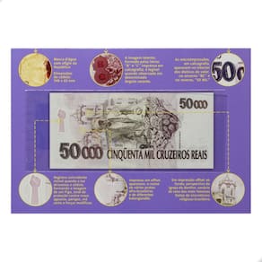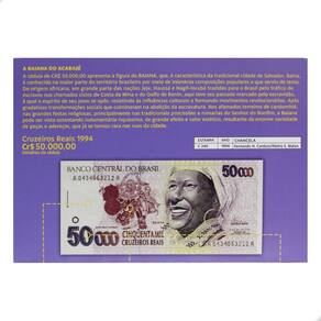 Folder Encarte para Cédula de 50000 Mil Cruzeiros Reais 1994 A BaianaO Folder Encarte para Cédula de 50000 Mil Cruzeiros Reais 1994 A Baiana descreve com detalhes os vários elementos que compõem a cédula de 50000 Mil Cruzeiros Reais 1994, além de apresentar as cores reais dessa cédula.Para armazenar a cédula, você deve abrir o plástico pela lateral esquerda e então ajustar a cédula. Este anúncio NÃO inclui a cédula.Informações Técnicas:Dimensão Fechada: L: 20,5cm x A: 14,3cmDimensão Aberta: L: 20,5cm x A: 28,6cm Marca: Banco Colecionável do Brasil