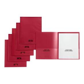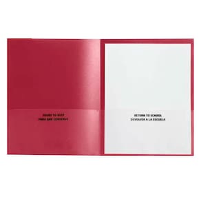 As pastas vermelhas para levar para casa School Smart oferecem proteção máxima e uma aparência divertida e elegante. A construção é feita de polipropileno granulado durável com uma borda clara em relevo para visualizar e colocar seus documentos ou cartões de notas mais importantes. Nossas pastas de 2 bolsos com bordas transparentes incluem um bolso esquerdo com compartimento para cartão de visita e indicações em texto bilíngue “Retorno às aulas”. Cada pasta de plástico para levar para casa para estudantes comporta até 100 folhas de papel.