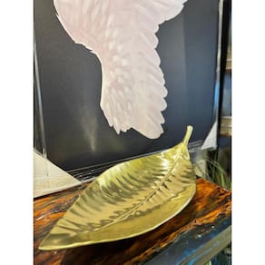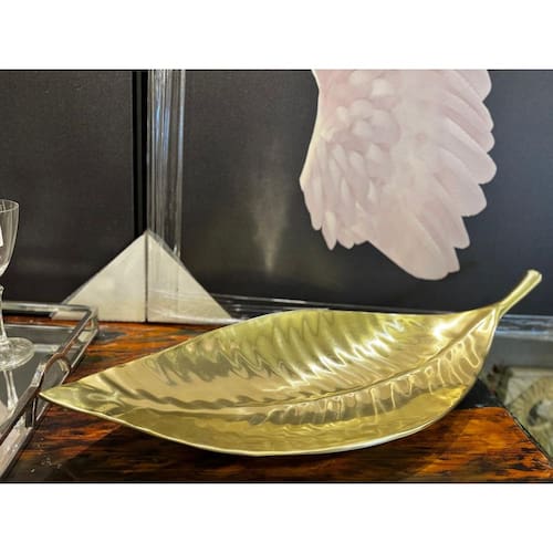 FOLHA DECORATIVA ALUMINIO GRANDE DOURADO 75X28CM Travessa folha decorativa em aluminio fundido dourado, com formato de folha e acabamento texturizado que reflete a luz de maneira elegante. O design alongado, com nervuras marcadas e um leve brilho metálico, transmite sofisticação e um toque contemporâneo.