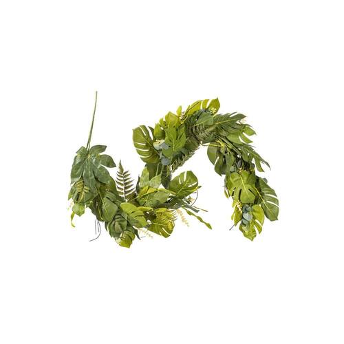 Guirlanda de folhagem de selva mista verde Vickerman de 6 pés. Este é um item artificial com uma combinação de folhas de monstera, aponica, samambaia e eucalipto.