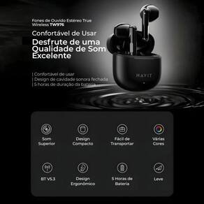 Fone Bluetooth TWS Havit TW976: A Liberdade Sem Fio com Tecnologia e Conforto de Elite O Áudio que Transforma Sua Rotina e Seu Game. Chegou o Fone TWS Havit TW976, o acessório definitivo para quem busca a união perfeita entre performance de áudio e liberdade total no seu dia a dia. Desenvolvido por uma das marcas mais conceituadas no cenário gamer, o TW976 herda a paixão por detalhes sonoros e a alta performance, entregando uma experiência imersiva não apenas para músicas, mas também para chamadas e jogos. Se você está cansado de fones com conexões instáveis, atrasos no som ou que machucam o ouvido, prepare-se para o futuro do áudio sem fio. Este fone é sinônimo de tecnologia de ponta, conforto ergonômico e som de qualidade HD. Sobre a Marca Havit: A Excelência Gamer Agora no Seu Áudio Pessoal A Havit é reconhecida globalmente por sua linha de periféricos de alta performance, sendo uma marca autoridade no mundo gamer. A expertise em criar equipamentos que exigem baixa latência, precisão sonora e durabilidade foi totalmente aplicada no desenvolvimento da sua linha de áudio. Ao escolher um Havit TW976, você não está apenas comprando um fone de ouvido, mas sim a de qualidade de uma marca que entende de performance e sabe que cada milissegundo e cada detalhe sonoro fazem a diferença. Trata-se de um produto que traz o DNA de alta performance da Havit diretamente para o seu uso diário, consolidando a marca como uma escolha inteligente e confiável no mercado brasileiro de áudio. Funcionalidades e Diferenciais do Havit TW976: Por Que Ele é a Sua Melhor Escolha O TW976 foi projetado para eliminar as frustrações comuns de fones sem fio e elevar sua experiência: Bluetooth V5.3 - Desempenho Imbatível Viés de Novidade : Equipado com a última geração do Bluetooth, a versão 5.3, o TW976 oferece o dobro da velocidade de transmissão, resultando em conexão ultrarrápida, latência baixíssima ideal para jogos e vídeos, evitando o incômodo atraso na voz e uma estabilidade de sinal aprimorada, além de ter o consumo de energia reduzido pela metade. Qualidade Sonora HD e Alto-Falantes Potentes: Com alto-falantes de 13mm, o áudio é potente e cristalino, entregando um som HD aspirado em modo estéreo. Desfrute de graves ricos e agudos claros, garantindo uma experiência musical notável ou a clareza total durante suas chamadas. Design Ergonômico e Discreto Viés de Conforto : Seu formato Earbuds é pequeno, leve e discreto. Com um tamanho que se assemelha à ponta do dedo, ele se ajusta perfeitamente aos contornos do ouvido, sendo quase invisível e garantindo máximo conforto, sem dor ou pressão. Controle Total na Ponta dos Dedos: Acesso fácil a comandos diretos no fone: atender/finalizar/recusar chamadas, assistente de voz, modo Game ON/OFF e controles de música. Praticidade que elimina a necessidade de pegar o celular a todo momento. Pareamento Automático Inteligente: Basta retirar o fone da case carregadora e ele se pareia automaticamente com o seu dispositivo, sem complicação. É a conveniência do plug and play na tecnologia TWS. Benefícios Exclusivos: Liberdade, Performance e Conforto: Experiência Livre de Lag: A tecnologia Bluetooth 5.3 garante transmissão em tempo real para chamadas e jogos, eliminando o irritante atraso do áudio e garantindo que você não perca nenhum momento crítico. Conforto para o Dia Todo: O design ergonômico e ultraleve garante que você possa usar o fone por horas sem desconforto ou sensação de peso, ideal para longas jornadas. Longa Duração de Bateria: Chegue a até 5 horas de uso contínuo para música e 3.5 horas em ligação, garantindo que o fone acompanhe sua rotina. A case fornece recargas adicionais. Portabilidade Extrema: Leve e discreto apenas 28,4g no total , é o companheiro ideal para esportes, trabalho ou lazer, cabendo em qualquer bolso. Compatibilida Homologação Anatel: 056562412374