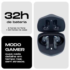 Especificações Bluetooth: V5.2 + EDR, suporte para iOS e Android Tamanho Driver: Ø10mm Distância máxima Bluetooth: 10 metros Resposta de frequência: 20 Hz – 20 kHz Impedância: 16Ohm Bateria: Lítio 3,7V / 450 mAh Tensão de carregamento: DC 5V/1A Autonomia bateria: até 32 horas de música, conforme utilização* Tempo de carregamento: aproximadamente 2 horas via Cabo, aproximadamente 4 horas via Carregamento Wireless