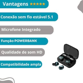 Descrição do anúncio: Tenha sempre seus fones de ouvido tws m10 à mão para apreciar suas músicas e podcasts favoritos em qualquer lugar. Com formato in-ear, esses fones melhoram a qualidade do áudio e são ideais para exercícios e outras atividades. A tecnologia tws oferece uma conexão sem fio completa, proporcionando uma experiência de som envolvente. O power bank de 2000mah pode carregar os fones até 5 vezes. Com uma carga completa, os fones oferecem de 4 a 6 horas de uso contínuo. Equipados com pareamento automático, tecnologia impermeável ipx7, som envolvente em 9d, controle de toque e compatibilidade com assistentes de voz como google e siri. Conteúdo da embalagem: 1 par de fones de ouvido sem fio esquerdo e direito 1 case de carregamento com display de energia digital led 1 cabo de carregamento 3 encaixes móveis de ouvido pequeno, médio e grande 1 manual do usuário Características: Versão do bluetooth: 5.3 Redução de ruído: cvc 8.0 Alcance de transmissão: cerca de 10 metros Capacidade da bateria dos fones: 50mah cada Tempo de carregamento do power bank: cerca de 2 horas Pareamento automático: sim Impermeável: ipx7 Som envolvente: graves poderosos em 9d Controle de toque: sim Uso binaural: pode conectar cada fone separadamente a dispositivos diferentes Especificações: Frequência de operação: 2.4ghz a 2.4835ghz Dicas fonéticas: apoio em inglês e chinês Compatibilidade: indicadores de bateria em aparelhos ios Distância eficaz: 10 metros Alto-falante: 8mm, plutônio as-xr Faixa de frequência eficaz: 50hz a 20khz Sensibilidade: 108 2 db Capacidade da bateria do fone: 60mah Tempo de carregamento do fone: 1 hora Tempo de carregamento do case: 2 horas Tempo de espera: 120 horas Tempo de uso contínuo música ou chamadas : 4-5 horas Funções: exibição de energia, controle de voz, função de chamada, música, conexão multiponto Canal: estéreo Cor: preto Principais perguntas sobre o produto e respostas: 1 qual é a duração da bateria dos fones de ouvido Com carga completa, os fones oferecem de 4 a 6 horas de uso contínuo 2 os fones são à prova d'água Não, mas possuem certificação ipx7, tornando-os resistentes à água e ao suor 3 como funciona o pareamento dos fones O pareamento é automático entre os fones, sendo necessário apenas parear com o dispositivo móvel na primeira utilização 4 o que é a tecnologia tws Tws true wireless stereo permite uma conexão sem fio completa, sem cabos entre os fones, proporcionando um som estéreo verdadeiro 5 quantas vezes posso carregar os fones com o powerbank incluído O powerbank de 2000mah pode carregar os fones completamente até 5 vezes 6 os fones têm controle de toque Sim, os fones possuem controle de toque para pausar músicas, atender chamadas e ativar assistentes de voz como google e siri 7 os fones podem ser separadamente em dispositivos diferentes Sim, é possível conectar cada fone separadamente a dispositivos diferentes, basta ligar um de cada vez Homologação Anatel: 084421912624 Marca: Não Informado