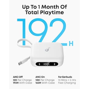 - Vida útil da bateria ultralonga: ouça por até 12 horas com uma única carga; o estojo a estende para 192 horas. Um reabastecimento rápido de 10 minutos oferece mais 5 horas de música.