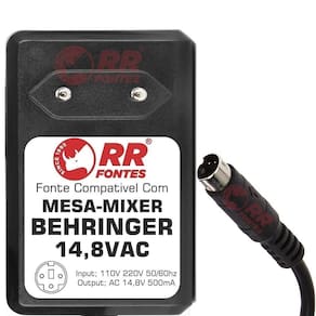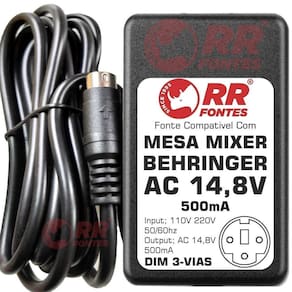 Fonte compatível com mixer mesa de som behringer xenyx eurorack. Ac 14,8vac 500ma x2, plug dim 3 vias, com chave de seleção de voltagem 110v/220v. Atende os seguintes modelos: Mx-6, Ub1002fx, Ub1202fx, Xenyx 1002fx, Xenyx 1202fx, Qx1002usb, Qx1202usb.Demonstração 360º