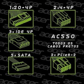 Essa fonte suporta placa de vídeo dedicada? Sim! A Fonte Acer AC550 possui conectores PCI-E e potência suficiente para placas de vídeo intermediárias e avançadas.