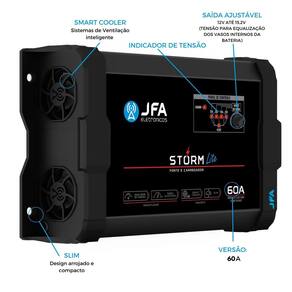 A Fonte e Carregador Storm Lite JFA é a melhor opção para alimentação do seu sistema de som, utilizando ou não baterias, com ótimo custo benefício. Seu diferencial é possuir a voltagem de até 15.2V, com a tensão para equalização dos vasos internos da bateria, única do mercado.