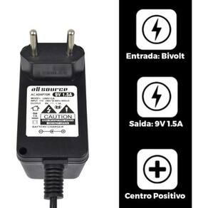 Especificações do produto: - input: bivolt 110 - 240v 50-60hz 0.33a - output: 9v - 1.5a positiva - plug: pino 1,7 mm x 4,0 mm - comprimento do rabicho: 1,60 metros - cabo de força: acompanha - medidas da fonte: comprimento = 7,2 cm / largura = 3,9 cm / altura = 4,9 cm - cor: preto - verifique também o pino conector, ele deve ser igual ao utilizado no seu aparelho comprimento e largura .