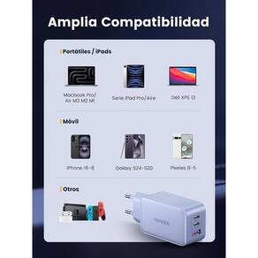 Carregador gan 65w o carregador gan ugreen 65w de 3 portas suporta power/delivery/3.0, quick/charge 4.0 +/ 3.0, scp, afc, 5v/ 2.4a, galaxy/super fast charging e pps. Tamanho compacto de apenas 6,4 7 3cm. Carregamento ultrarrápido este carregador usb c com tecnologia gan oferece uma carga máxima de 65w, o suficiente para carregar seu/macbook/pro de 13 na velocidade máxima. A energia será distribuída entre as 3 portas para garantir um melhor carregamento ao conectar vários dispositivos. Compatibilidade universal esta tomada usb-c é compatível com /16//16/plus//16 pro/ /16/pro/max/15/14/13/12/11, galaxy/s24/ s24 +/ s24 ultra/ s23/ s22 / s21, galaxy a15/ a25/ a35/ a55/ a05s, pixel/9/8/7/6, macbook/air/pro/m3/m2/m1,//pro/air/mini, galaxy/tab, steam/deck, etc. Seguro e confiável o carregador rápido usb c equipado com um chip inteligente para proteger seus dispositivos contra curto-circuito, sobretensão, superaquecimento e sobrecorrente. A excelente resistência ao fogo ul94-v0 e a robusta caixa de pc garantem um carregamento seguro. Quão poderoso é este carregador usb-c Este carregador usb c suporta potência máxima de 65w. Saída usb-c1/c2: 5v/3a, 9v/3a, 12v/3a, 15v/3a, 20v/3,25a, 65w máx.; pps: 3,3-21v/3a Saída usb-a: 4,5v/5a, 5v/4,5a, 5v/3a, 9v/2a, 12v/1,5a, 22,5w máx. Quais protocolos de carregamento rápido são suportados por este carregador usb-c de 65w Este carregador usb c de 65w suporta vários protocolos de carregamento rápido, como power/delivery/3.0, pps, quick/charge 4.0+/ 3.0, fcp e afc para ser compatível com vários dispositivos. Quais são as dimensões e peso deste carregador As dimensões deste carregador são 67 40 31 mm. O comprimento do plugue é de 39 mm. O peso é de 135 gramas. O cabo de carregamento não está incluído. Este carregador vem com o cabo de carregamento rápido Não. Apenas carregador de parede usb-c de 65w, cabo de carregamento não incluído. Homologação anatel: 166292013501 -marca ugreen -cor azul -portas usb-c 2 usb-a 1 14,9 x 10 x 3,8 cm; 230g