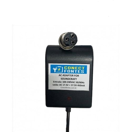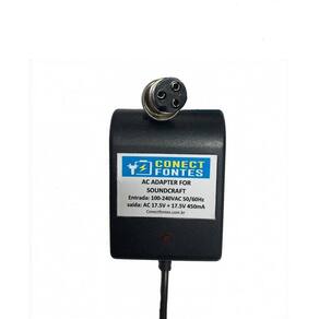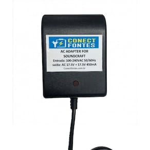 Fonte de alimentação ac/ac 17.5 + 17.5v 450ma Bivolt para mesas de áudio com led soundcraft . Entrada: 100-240v com chave seletora Saída: 17.5v x2 450ma Produto novo nacional, utilizada em diversos modelos de mesas de áudio.
