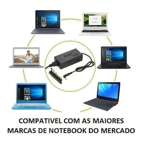 Fonte Carregador Universal Notebook Adaptador 120w Características: - Voltagem de entrada: AC 110-240V Bi-volt - Freqência: 50/60hz - Corrente de entrada: 1.3A Máximo - Voltagem de saída: 12v /15v / 16v / 18v / 19v / 20v 4.5A Máximo. - Proteção de sobrecarga: Sim - Proteção de curto-circuito: Sim - Potencia de saída: 120 w Máximo Seguintes voltagens: 12v/ 15v /16v / 18v / 19v / 20v / 22v e 24v - Compatível com a maioria dos notebooks do mercado possui 10 tipos de conectores.