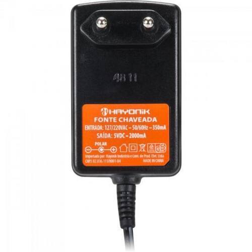 Fonte chaveada 5vdc 2a 10w p4 c+ fctp5002 bivolt hayonik Potência:10w Pinos:p4 centro + Tensão entrada:85 a 240vac Tensão saída:5 vdc Corrente:2a Dimensões:70 x 40 x 25 a x l x p Peso:190g :90dias Ean: 7899456700311