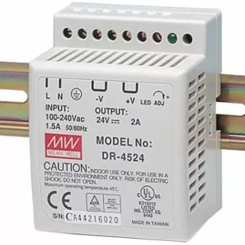 Fonte chaveada MW MeanWell Entrada 100 a 240Vac Saida 24Vdc 2,0A 48W Sinal DC indicado por led Fixação em trilho din Proteção contra curto circuito Ajuste de tensão de saida + - 10% Dimensão: 93 x 78 x 67mm Marca: Mean Well